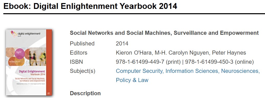 The 2014 Digital Enlightenment Yearbook gathers together the science, social science, law and politics of the digital environment in order to help us reformulate and address the timely and pressing questions which this new environment raises. We are all of us affected by digital technology, and the subjects covered here are consequently of importance to us all.